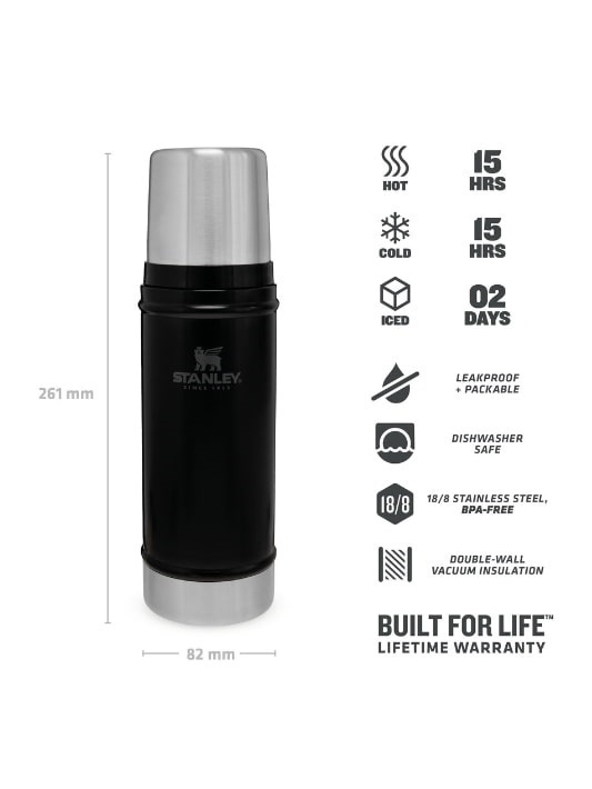 محصولی بسیار کاربردی و با کیفیت از کمپانی آمریکایی استنلی می باشد که این کمپانی با سابقه ای بیش از یک قرن در زمینه تولید تجهیزات کمپینگ مانند ظروف غذا، فلاسک، قمقمه و … فعالیت می کند و طرفداران بسیاری در سراسر جهان دارد. از آن جا که این کمپانی در ابتدا محصولات خود را جهت ارائه به نیروهای دریایی و هوایی تولید کرد، تمرکز و هدف اصلی خود را در راستای افزایش طول عمر آن ها قرار داد. به طوری که این محصولات در ماجراجویی ها و سخت ترین شرایط مانند دمای 70- درجه سانتی گراد، طوفان های شدید، افتادن از ارتفاع 1200 متری و حتی اصابت گلوله مقاوم می باشند.در روزهای گرم تابستان در هنگام سفر و کمپینگ و نیز فعالیت های مختلف مانند کوهنوردی، همیشه نیاز به یک نوشیدنی خنک احساس می شود؛ همچنین در سرما، نوشیدن یک چای گرم و یا قهوه می تواند خستگی شما را پس از گردش و پیاده روی طولانی مدت رفع کند تا ادامه روز را با انرژی بیشتری سپری کنید. در این صورت به همراه داشتن فلاسک 470 میلی لیتری استنلی مدل Classic Legendary گزینه ای بسیار ایده آل برای نگهداری انواع نوشیدنی های گرم و سرد شما می باشد.این محصول دارای ظرفیتی برابر با 470 میلی لیتر بوده و از بدنه ای مقاوم از جنس فولاد بسیار با دوام ساخته شده است. بدنه فولادی این محصول مقاومت زیادی در برابر ضربه و زنگ زدگی داشته که به شما این امکان را می دهد تا بتوانید مدت ها از آن استفاده نمایید. دیواره این محصول مجهز به عایق دو جداره با لایه میانی خلاء بوده که از قابلیت حفظ دما در مدت زمان طولانی برخوردار است؛ به این صورت که قابلیت نگهداری 15 ساعت نوشیدنی گرم، 15 ساعت نوشیدنی خنک و نگهداری قطعات یخ به مدت 2 روز را دارا می باشد. این فلاسک مجهز به یک درپوش پیچی با قابلیت استفاده به عنوان لیوان و یک درب پیچی با واشر عایق است که پس از بسته شدن آن، دیگر نگران نشتی محتویات داخل فلاسک نخواهید بود. از دیگر ویژگی های فلاسک 470 میلی لیتری Classic Legendary این است که علاوه بر حفظ دمای مایعات در مدت زمان طولانی، مانع از تغییر بوی آن ها نیز شده و برخلاف برخی محصولات به نوشیدنی شما طعم و بوی فلز را نخواهد داد. در ساخت این محصول از مواد بدون BPA (نوعی ماده سمی) استفاده شده تا حفظ سلامت شما را تضمین کند. در ضمن فلاسک استنلی قابلیت شستشو در ماشین ظرفشویی را داشته و آسیبی به آن وارد نخواهد شد.