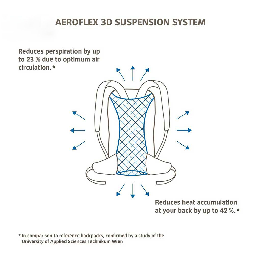 • پشتی با سیستم آیروفلیکس سه بُعدی AEROFLEX 3D با تهویه ی چهار طرفه و قابلیت سایز مناسب بانوان و آقایان از سایز S تا XL